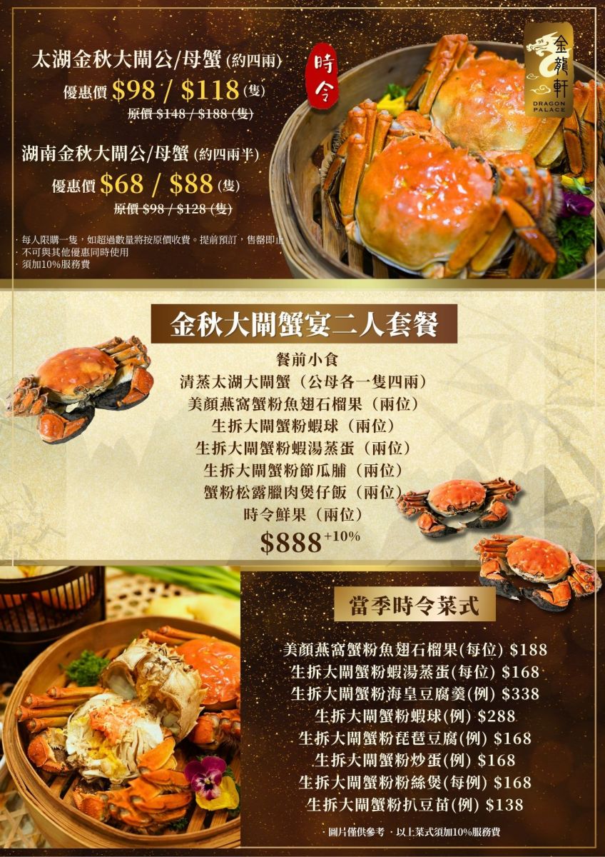 • 时令单点包括:美颜燕窝蟹粉鱼翅石榴果、生拆大闸蟹粉虾球等都只需MOP138+起!